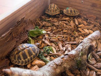 Die Schildkröten dürfen in den warmen Monaten in einem eingezäunten Bereich auf unserer Terrasse frei herumlaufen, wo die Kinder sie hautnah beobachten können.