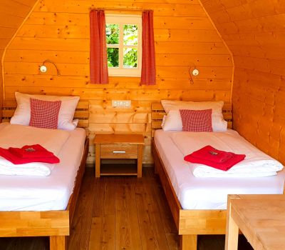 Neben Ihrer Hütte mit den zwei gemütlichen Betten, für die bei Bedarf auch Bettzeug gemietet werden kann, können selbstverständlich alle Einrichtungen unseres Campingplatzes wie Sanitäranlagen, Kochstelle, Badeweiher, etc. mitbenutzt werden.